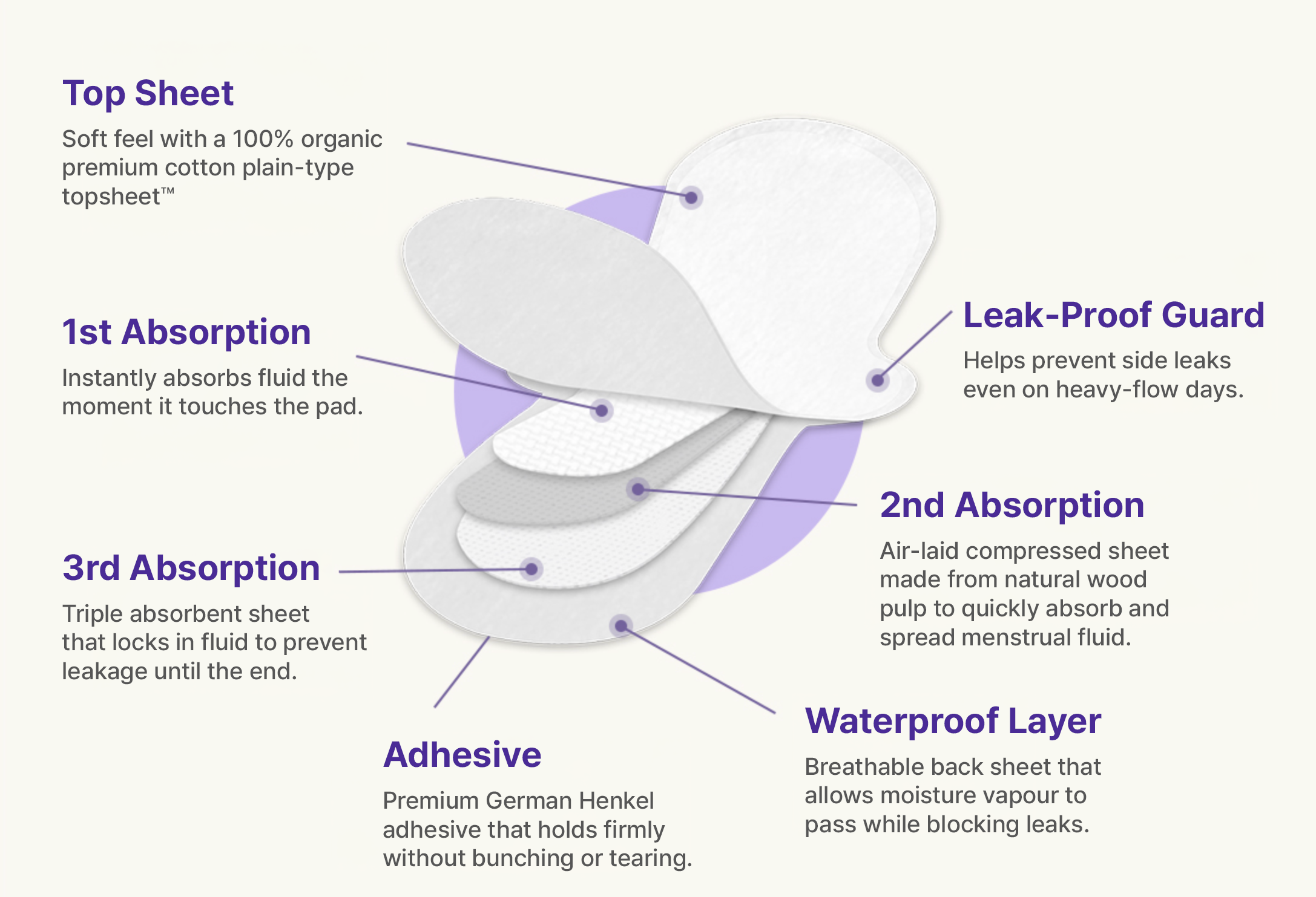 Deep absorbent layers quickly draw in fluid and lock it away, helping you stay dry and comfortable even on heavier days.